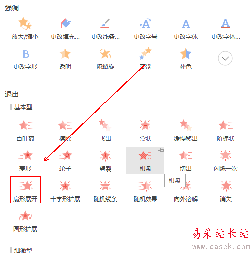 5、在彈出的菜單列表中單擊【退出】-【扇形展開】選項