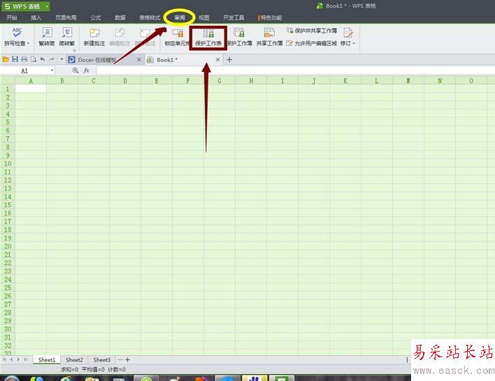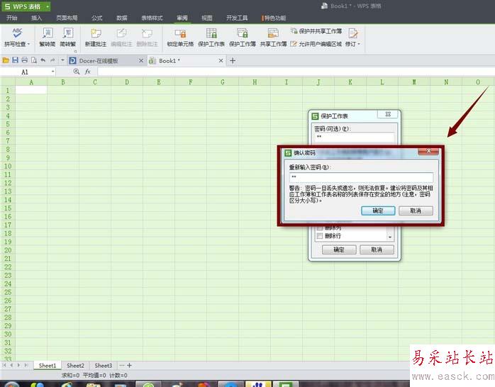 3、接著繼續(xù)選中單元格,然后點擊表格工具欄的"審閱",我們可以看到在右下有“保護工作表”選項。點擊它會彈出要求對單元格加密的對話框,輸入密碼就完成了對整個單元格的鎖定(務必記住密碼,因為丟失密碼將無法恢復)