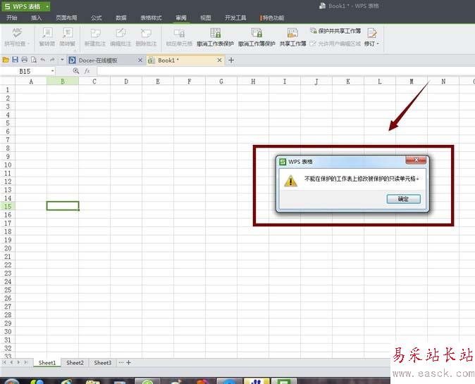 4、此時,就完成了對整個Sheet1表格的鎖定,這時我們是無法編輯的,一旦輸入任何內(nèi)容都會有提醒“不能再保護的工作表上修改被保護的只讀單元格”,如圖。