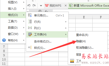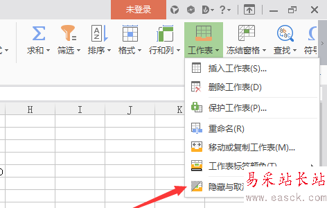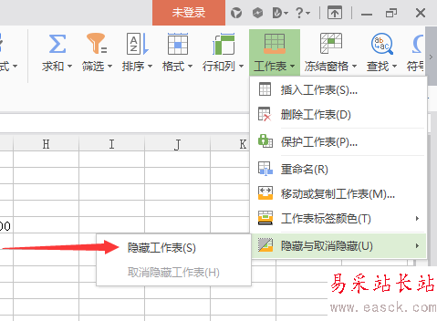 3、進行點擊了工作表之后,彈出了下拉菜單選中為隱藏與取消隱藏的選項。
