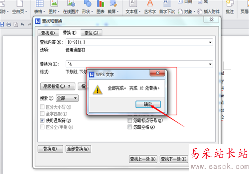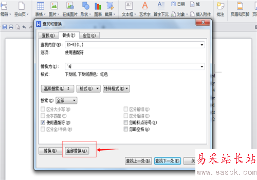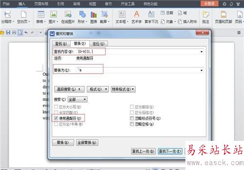 在替換對話框當中,我們要輸入命令,如下圖,在查找內容欄目輸入 [0-9,{1},替換為欄目輸入^&,下面勾選【使用通配符】,點擊確認。