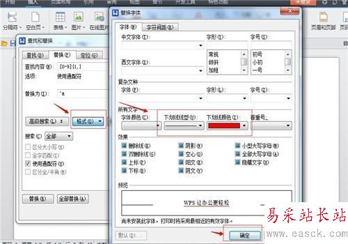 還可以在第三步驟當中,點擊【格式】,選擇【字體】。設置下劃線的內容的顏色,如下圖,在所有文字欄目當中選擇下劃線顏色為紅色,點擊確認。