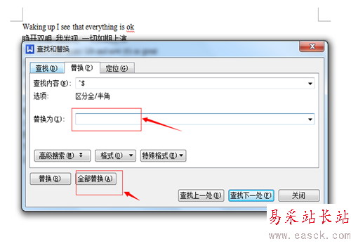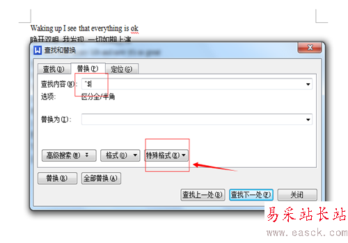 在查找替換對話框當中,點擊“特殊格式:選擇”任意字母“然后查找內容欄就會出現‘s這個符號。