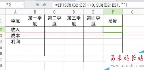 6、細心的朋友,可能會通上面幾張圖看出F2中的公式和最初圖中顯示的公式不同。圖中有0時,F2的公式是=SUM(B1:E2),而圖中無0時,F2的公式卻是=IF(SUM(B2:E2)<>0,SUM(B2:E2),""),那么公式=IF(SUM(B2:E2)<>0,SUM(B2:E2),"")有什么含義呢?