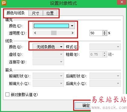 3、在“設置對象格式”控制面板中,設置好你喜歡的填充色,透明度,線條色(一般情況下線條色選擇無線條色,看起來更自然),尺寸,位置等,設置好后,點擊右下角的確定按鈕。
