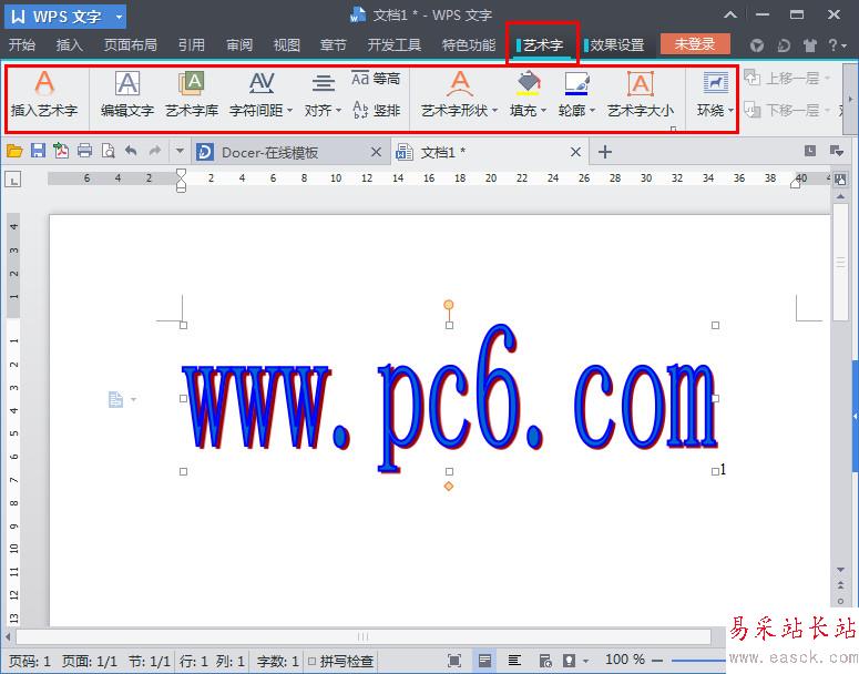 5、選擇藝術字我們可以看到在菜單欄中多出了一個藝術字的選型卡,大家可以再這里設置藝術字的各種格式。