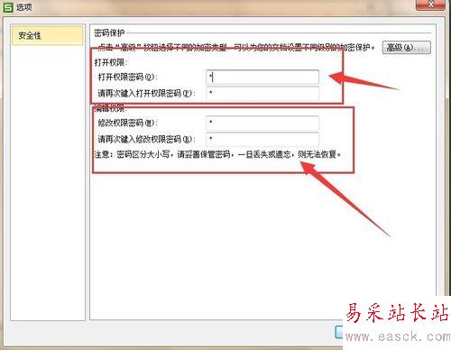 4、彈出加密對(duì)話框,然后根據(jù)提示進(jìn)行設(shè)置打開(kāi)密碼和編輯密碼,輸入密碼后點(diǎn)擊“確定”,即加密成功;