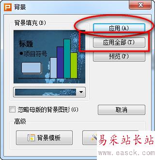 5、點擊”確定“后回到背景對話框,你可以選擇”應用“(應用于一張幻燈片,即當下這張),點擊”應用全部“(應用于所有的幻燈片。)