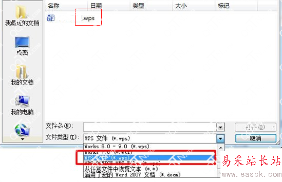 2、在彈出的“打開”窗口中找到 .WPS 文件的位置,然后在“文件類型”中選擇“WPS 文件(*.wps)”,單擊“打開”按鈕,即可在Word中打開WPS的文件。