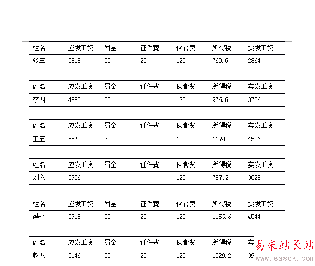 按一下“全部替換”按鈕,關(guān)閉“查找和替換”對(duì)話框,此時(shí),你將發(fā)現(xiàn)除了文檔開頭和頁眉頁腳多出一行表頭和一些回車符外,所有的數(shù)據(jù)行上方都有一行表頭,并且下方有一個(gè)空行。刪除多余的表頭行,全選文檔,從“表格”菜單中選擇“轉(zhuǎn)換→文本轉(zhuǎn)換成表格”,確定后即可將所有數(shù)據(jù)轉(zhuǎn)換成一個(gè)表格。美中不足的是,空的表格行中也有縱向的線條,顯得不夠美觀。這一點(diǎn),我們可以用將所有縱向表格線全部設(shè)置為“無邊框”模式,即只顯示橫向表格線的方法來解決,最后打印的效果如圖4所示。