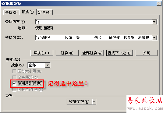 接下來,制作第1行表頭的內(nèi)容到剪貼板中,然后按下快捷鍵“Ctrl+H”,調(diào)出“查找和替換”對(duì)話框,在“查找內(nèi)容”中輸入“^p”,并把剛剛復(fù)制的表頭粘貼到“替換為”中文本框中,并在其前面連續(xù)輸入兩個(gè)“^p”,后面再輸入一個(gè)“^p”,并注意選中“使用通配符”(如圖3)。