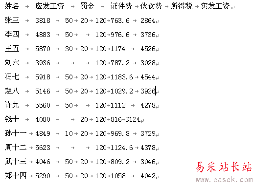 關(guān)閉WPS表格(一定要關(guān)閉,不然粘貼到WPS文字時(shí)會(huì)有表格),打開WPS文字,按“Ctrl+V”將從源文檔中復(fù)制來的數(shù)據(jù)粘貼到新建的空白文檔中。此時(shí),這些數(shù)據(jù)呈用制表符和回車符分隔的文本狀態(tài)(圖2)。