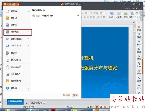 單擊左上角的“WPS演示”字樣,注意不是旁邊的的倒三角號,單擊倒三角號彈出不一樣的菜單,不信試試吧。