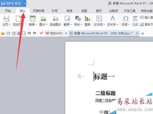 4、做好上面的標題規范之后,那么就到自動添加目錄的操作了。如圖選擇插入選項。