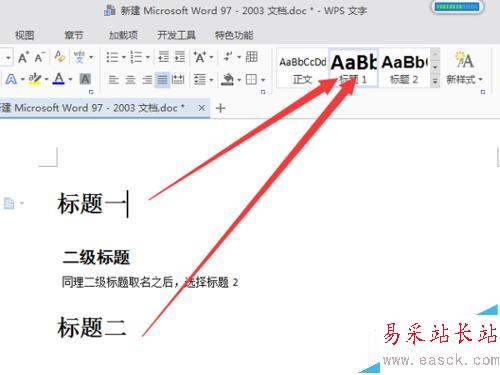 1、首先,要做的是標題要規范。同一等級的標題,字體規范一樣。比如在命名標題一、標題二的時候選擇工具欄上的標題1規范。
