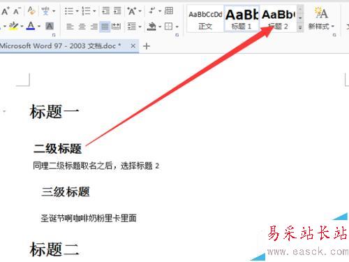 2、同理,下一等級的子標題也要做到相同規范。如圖,二級標題選擇工具欄上的標題二。依次類推,有多級標題,就這么進行下去就可以了。