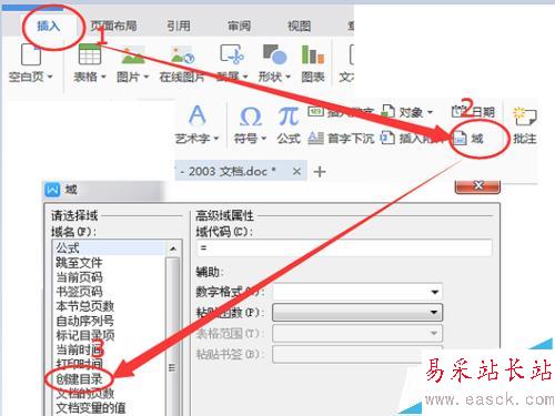 5、光標停在首頁的頂部。選擇插入之后,選擇域,然后創建目錄。可以在創建目錄的界面中進行一些設置,但是如果沒什么特殊要求的話,默認就可以了。點擊確定。
