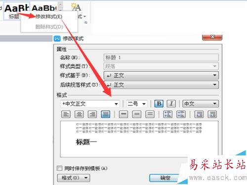 3、工具欄上的標題規范是有默認字體和大小的,如果想要自己設置標題字體和大小。如圖,可以把鼠標放到標題規范上,點擊右鍵,選擇修改樣式,在彈出的窗口中進行修改就可以了。