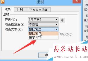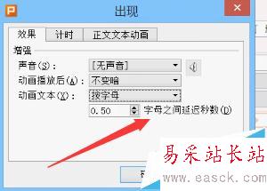 6、設(shè)置一個(gè)字一個(gè)字出現(xiàn),與前面一樣。不同的是在動(dòng)畫文本中,點(diǎn)擊按字母設(shè)置字母之間延長(zhǎng)秒數(shù)就ok啦