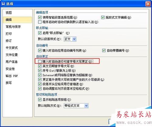 6、把選項“鍵入時自動進行句首字母大寫更正”前面方框的勾勾取消。