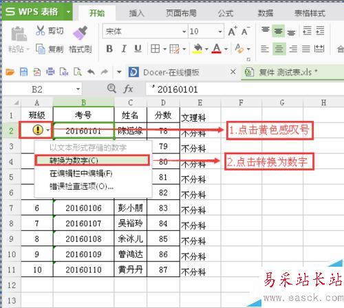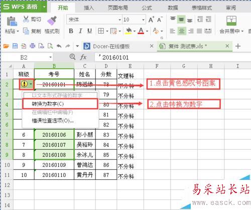 2、點(diǎn)擊黃色感嘆號(hào)的三角下拉按鈕,之后點(diǎn)擊轉(zhuǎn)換為數(shù)字,如圖: