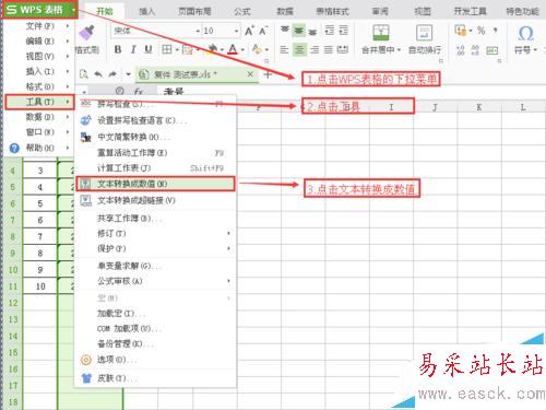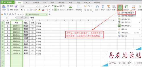 2、在開始一項(xiàng)找到格式,點(diǎn)擊“格式”下拉箭頭菜單,之后點(diǎn)擊選擇“文本轉(zhuǎn)換成數(shù)值”或是點(diǎn)擊“wps的下拉菜單”之后點(diǎn)擊“工具”,最后點(diǎn)擊選擇“文本轉(zhuǎn)換成數(shù)值”如圖: