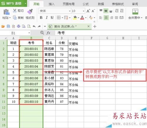1、選中要把“以文本形式存儲(chǔ)的數(shù)字”轉(zhuǎn)換成數(shù)字的一列,如圖: