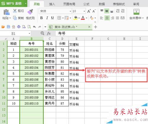 3、左上角青色符號(hào)消失,整列“以文本形式存儲(chǔ)的數(shù)字”成功轉(zhuǎn)換成數(shù)字,如圖: