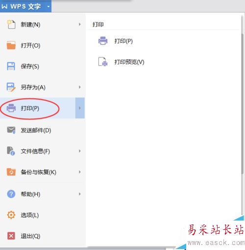 2、在點擊【WPS文字】按鈕后彈出的菜單下,點擊選擇【打印】選項。(如圖所示)