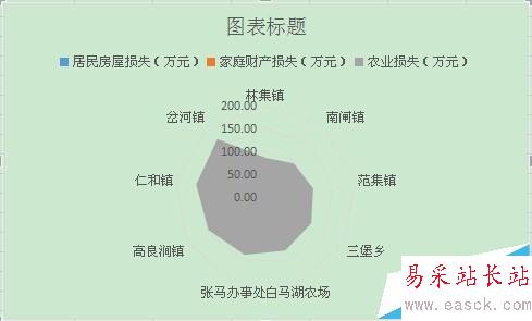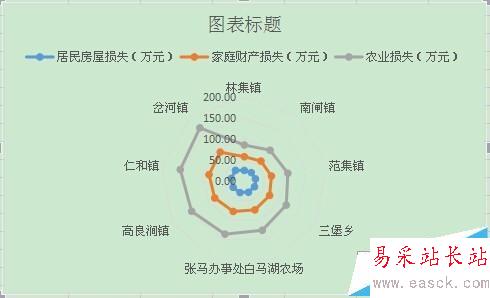 4、這樣就得到了生成的雷達圖,圖表上方是標題,可以進行修改,標題下方是圖例。顯示的是三類數據。最下方展示的雷達圖形