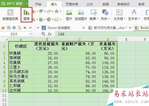 2、用鼠標左鍵框選 中非空數據單元格,或者選中一個非空單元格,然后 按Ctrl+A,這樣的效果是一樣的。在菜單欄中選擇 “插入”——圖表工具按鈕。