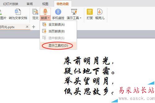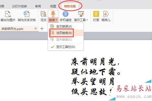3、選中文本,單擊居中工具居中一下。單擊特色功能---朗讀---當(dāng)頁(yè)朗讀。