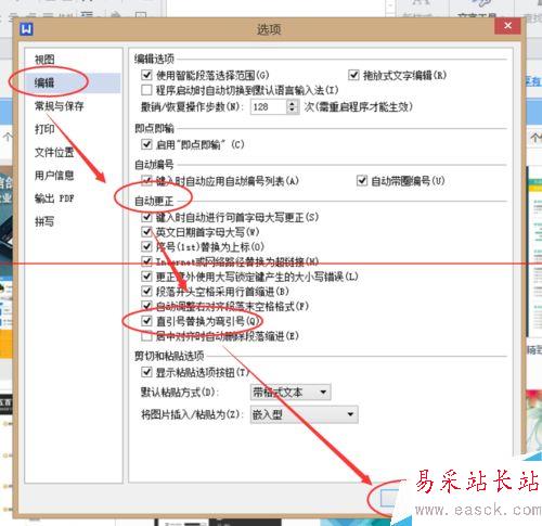 3、在【選項(xiàng)】界面下,點(diǎn)擊選擇【編輯】--【自動(dòng)更正】--勾選【直引號(hào)替換為彎引號(hào)】--【確定】選項(xiàng)完成設(shè)置。(如圖所示)