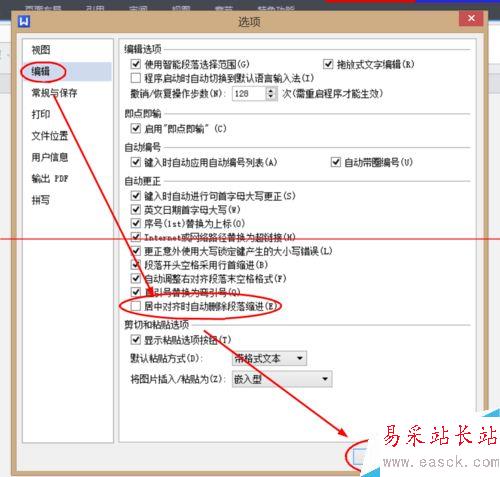 3、在【選項】界面下,點擊選擇【編輯】--勾選【居中對齊時自動刪除段落縮進】--【確定】選項完成設置。(如圖所示)
