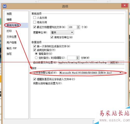 3、在【選項】界面下,點擊選擇【常規(guī)與保存】選項,點擊【文件保存默認(rèn)格式選項框】。(如圖所示)