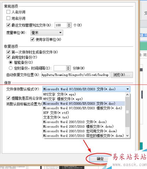 4、在點擊【文件保存默認(rèn)格式選項框】后彈出的保存格式列表里選擇想要設(shè)置為默認(rèn)保存的格式,點擊【確定】選項完成設(shè)置。(如圖所示)