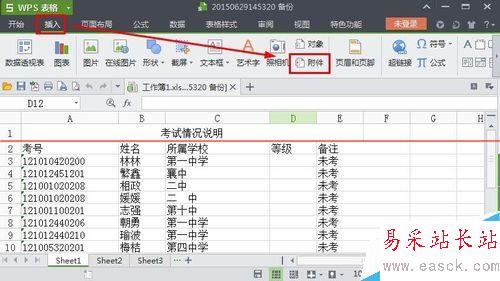 2、這時(shí)候如果想要在這個(gè)表格中添加附件的話,我們可以點(diǎn)擊插入菜單中附件。