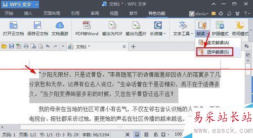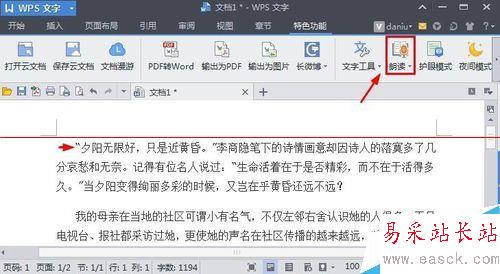 5、現在我們將鼠標點到文章的開頭,然后點擊特色功能中的朗讀按鈕,這樣就開始朗讀文章了。