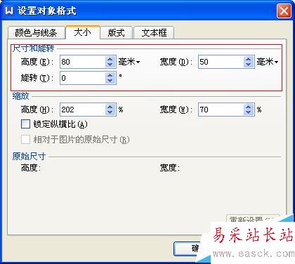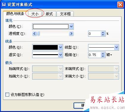 3、在設置對象格式窗口中,點擊“大小”選項卡