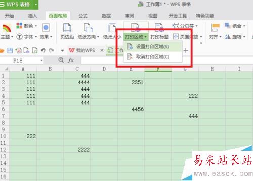 4、然后鼠標點擊選擇頁面布局下的“打印區域——設置打印區域”