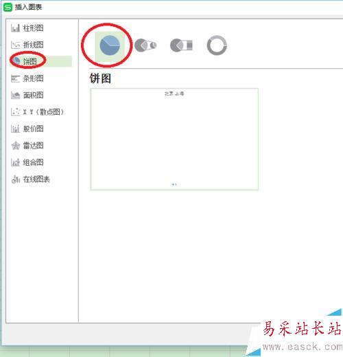 4、然后點擊選擇餅圖,在右上方點擊選擇相應合適的餅狀圖即可。