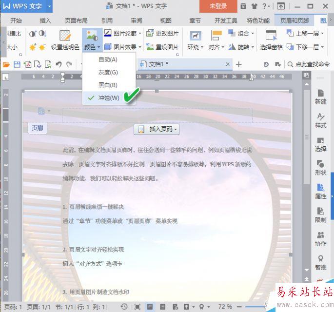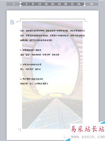 如果要實現(xiàn)跨越版心,覆蓋頁眉、頁腳的水印圖片,可借助于頁眉設置來完成。雙擊頁眉進入頁眉頁腳設置,點擊“插入圖片→來自文件”按鈕菜單命令,選擇一張背景圖片插入;然后通過“布局選項”的“文字環(huán)繞”列表,選擇“襯于文字下方”;拖動圖片的四個邊角,將圖片縮放到超出版心的任意位置。這樣就實現(xiàn)了背景水印圖片的“出血”編排。如果要實現(xiàn)背景圖片的透明,可在選中圖片后選擇“顏色”菜單下的“沖蝕”效果。