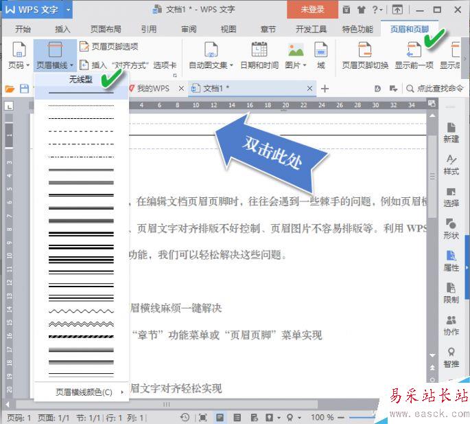 此外,還可以在版面打開后,直接用鼠標雙擊頁眉處。這時,“頁眉與頁腳”菜單將自動開啟,同樣也會出現(xiàn)“頁眉橫線”菜單,選擇“無線型”即可。