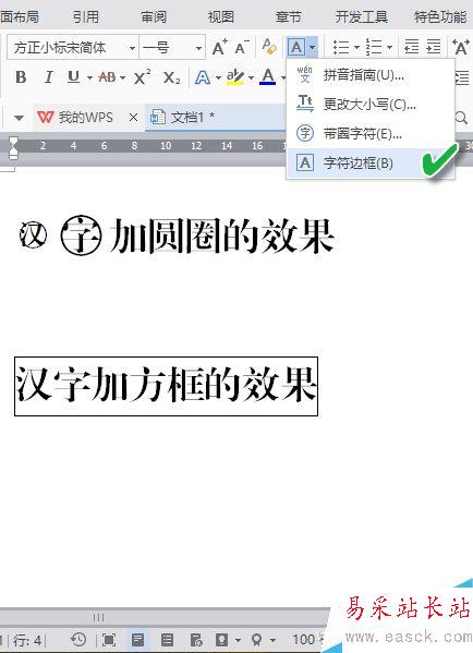 如果要給文字添加邊框效果,雖然用上述“方框”類型可實現單個漢字的邊框顯示。但如果要給一行文字添加整體邊框,需要通過“帶圈字體”字體菜單中的“字符邊框”命令來實現。