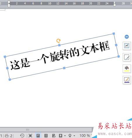 通過WPS“插入→文本框”命令插入一個文本框(Word 2016的操作為“插入→文本→文本框”),之后選中文本框后發現其邊框中央部分有一個半圓形的箭頭按鈕,通過按下該按鈕并拖動鼠標,即可實現文本框的任意旋轉。如果希望傾斜的文字在版面中以無邊框的狀態出現,可點擊右側設置工具條最下方的線條按鈕,將線條設置為“無”即可。