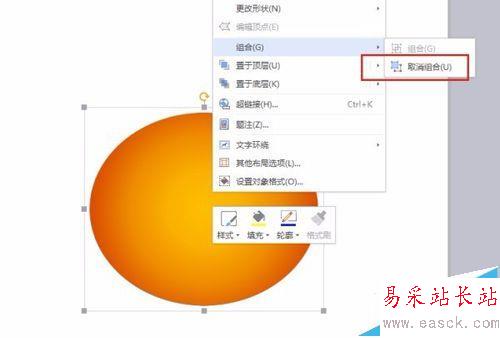 8、再橢圓中按右鍵選擇“取消組合”如圖所示