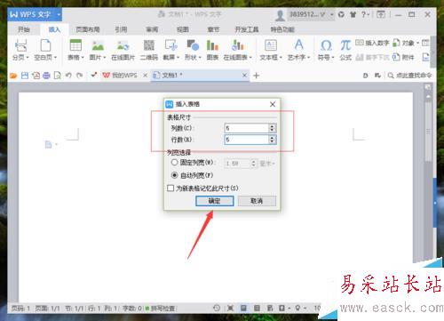 4、在插入表格對話框中,修改需要插入的行和列數量,再點擊“確定”按鈕。如圖所示;