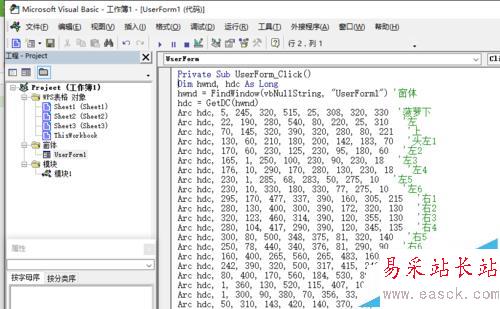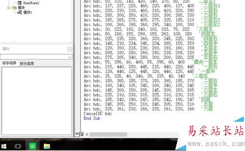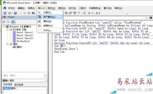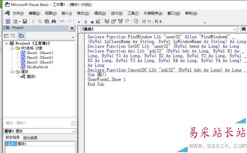2、點(diǎn)擊“插入”——“模塊”,就會(huì)彈出“模塊1”,在這里就可以編程了。我們?cè)谀K1里聲明4個(gè)函數(shù):FindWindow函數(shù)是尋找活動(dòng)窗口,GetDC函數(shù)用來(lái)找畫(huà)布,Arc是畫(huà)橢圓的函數(shù),CancelDC是釋放畫(huà)布。在模塊1里,我們編寫(xiě)一個(gè)程序,名字叫“畫(huà)”,只有一句程序,是用來(lái)顯示窗體的。