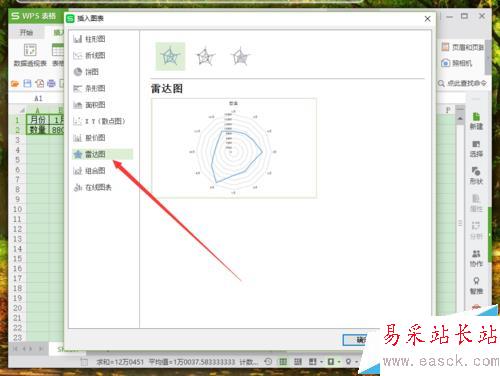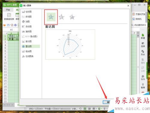 6、在雷達圖選項卡的右側窗格,選中“雷達圖”選項圖形,并點擊“確定”按鈕。如圖所示;