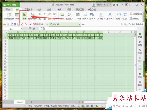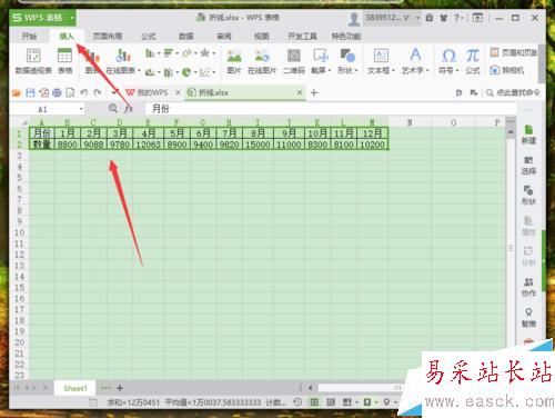 2、在打開的Wps表格程序窗口,選中要制作圖形的參數單元格,打開“插入”菜單選項。如圖所示;